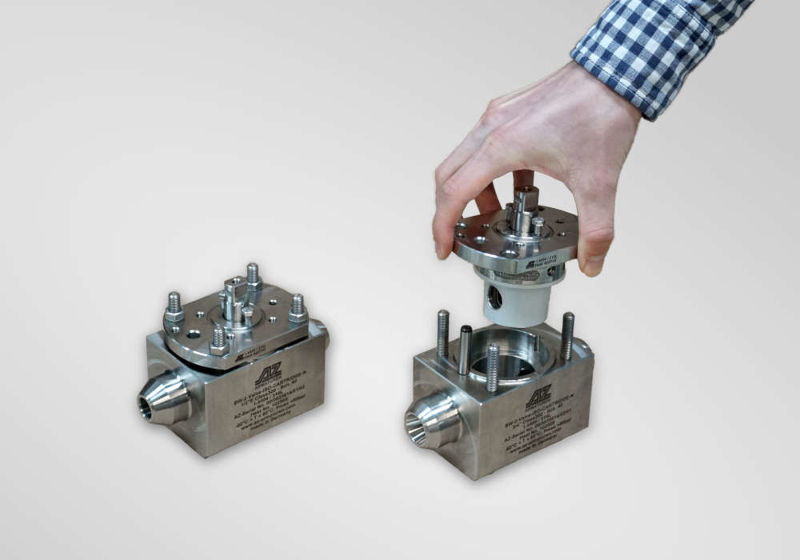 Block-Einschweißarmatur mit geschmiedetem Gehäusematerial, Kartusche mit codierter Montageposition (Codierstifte) für schnellen, einfachen und sicheren Einbau bzw. Wartung und Austausch.